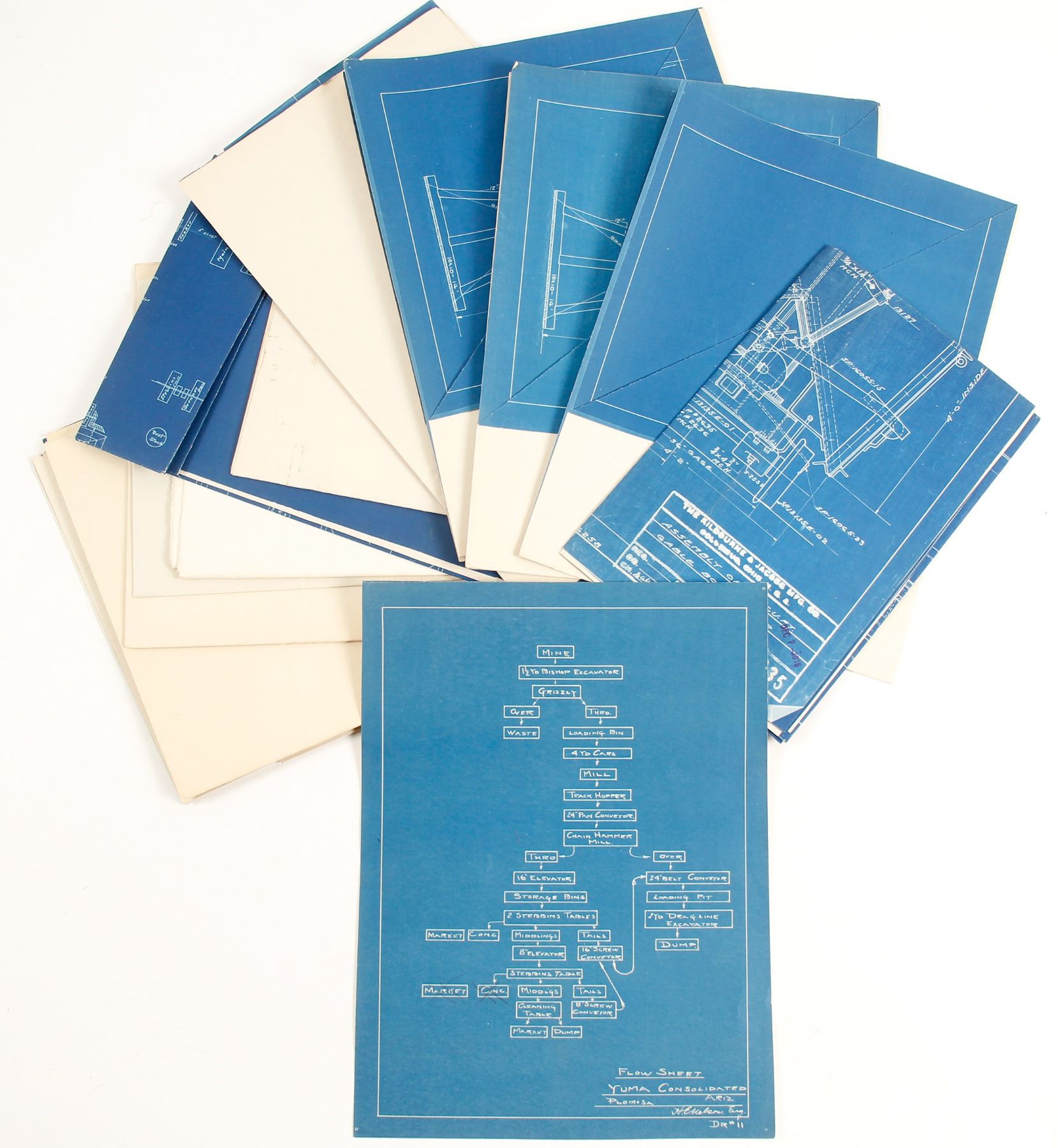 Collection of 19 blueprints: loading bin, Quenner disintegrator, carriage frame, concentration plant and many more