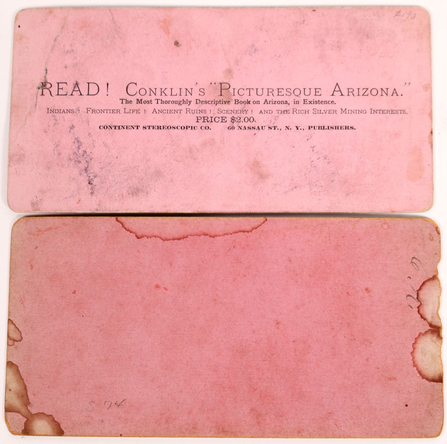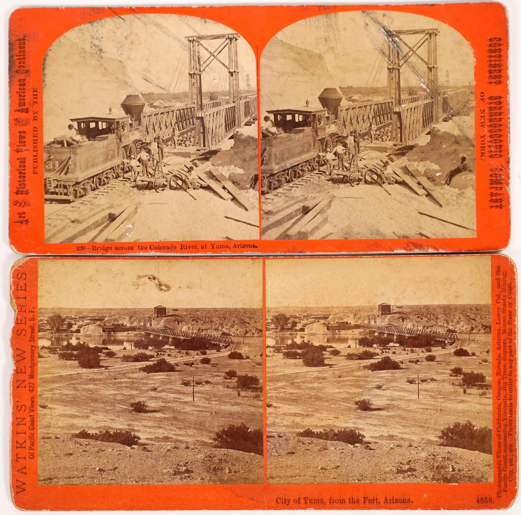 1.) Carlton Watkins no4858 Entitled City of Yuma from the Fort Arizona. Edge damage at right and left with some foxing in the photo. Miner water damage shown on reverse. 2.) By Continent Stereographic Company on the reverse reads "READ! Conklin's picturesque Arizona". No 230 "Bridge Across the Colorado River at Yuma, Arizona" Photograph has stains at left diagonal scratch in the right image. This group dates c1880-90