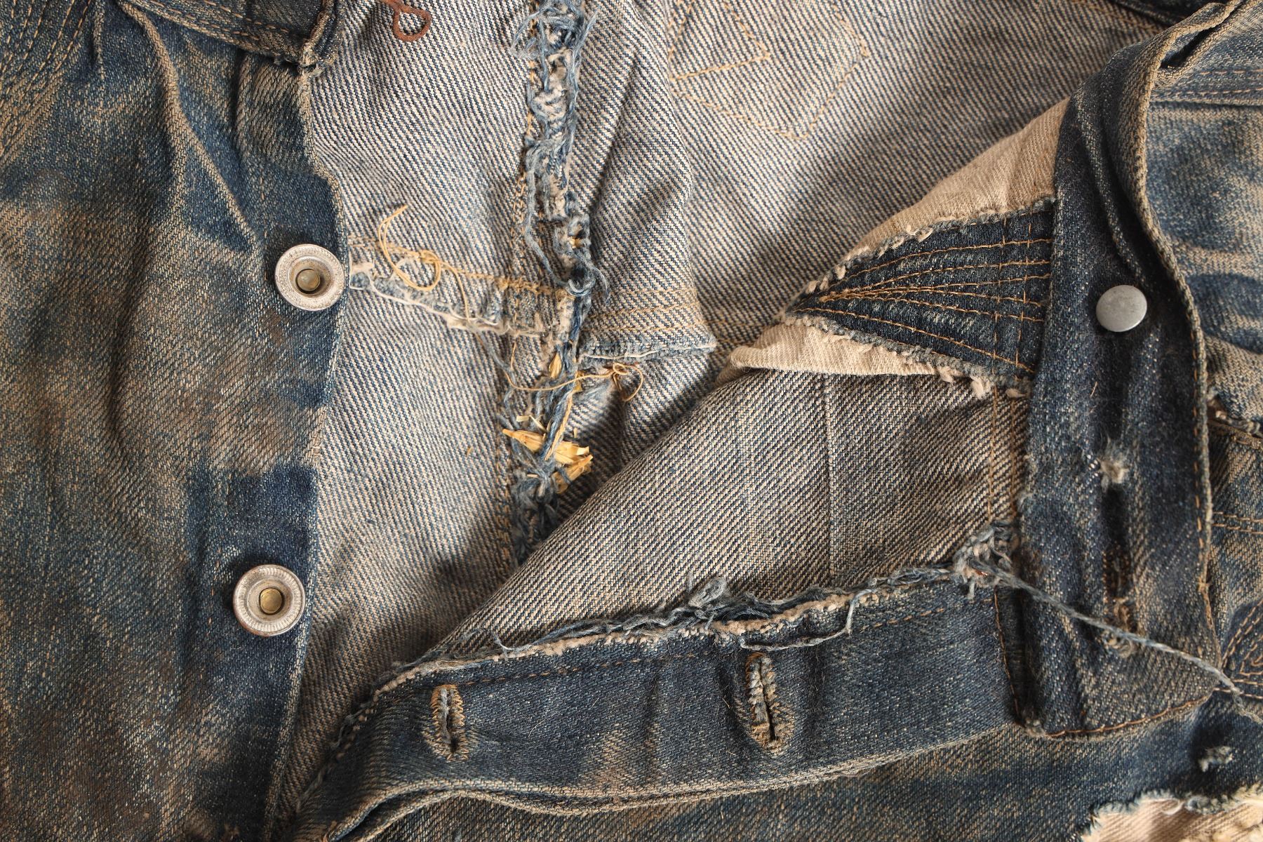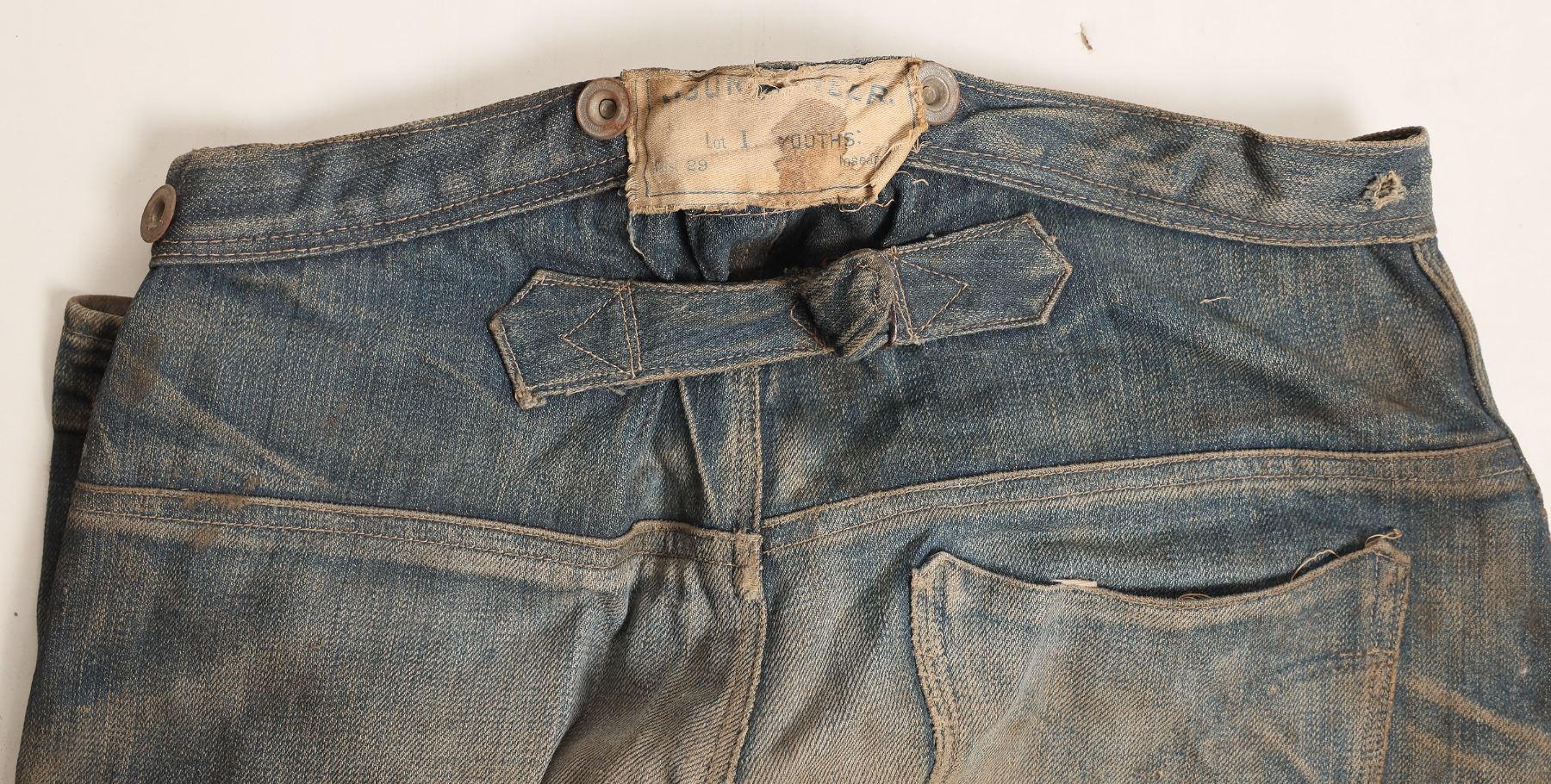 Mountaineer brand youth size overalls 29" waist. Rear belt has intact label. Stitch patterns above pockets fairly complete. Missing patch on left knee. Similar buttons on pocket and rear. Also oil stained. Mountaineer brand made by ZCMI. See the pants in this catalog with the long story on ZCMI and their well known Mountaineer brand that was used from the early 1870s-c1890s. [Salt Lake City] [Utah] [] [] []