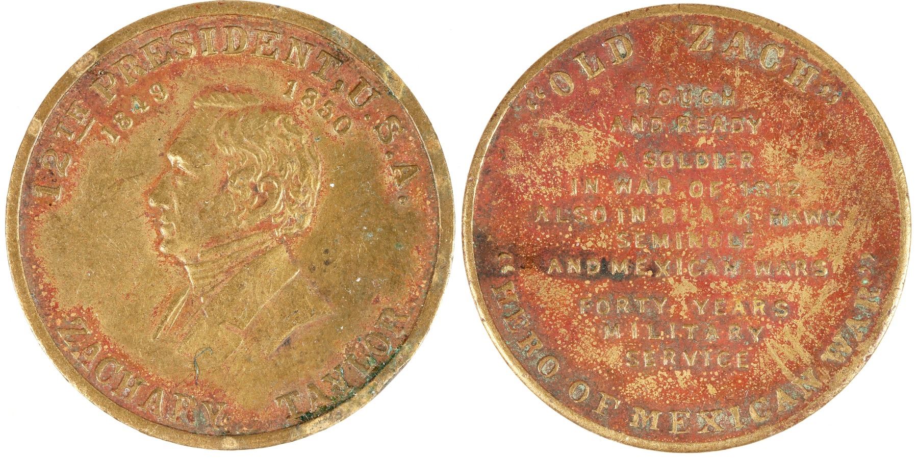 12th President U. S. A. / 1849 / 1850 / Zachary Taylor // "Old Zach" / Rough / And Ready / A Soldier / In War of 1812 / Also in Black Hawk / Seminole / And Mexican / Wars / Forty Years / Military / Service / "Hero of Mexican War"; Br., rd., 25 mm.