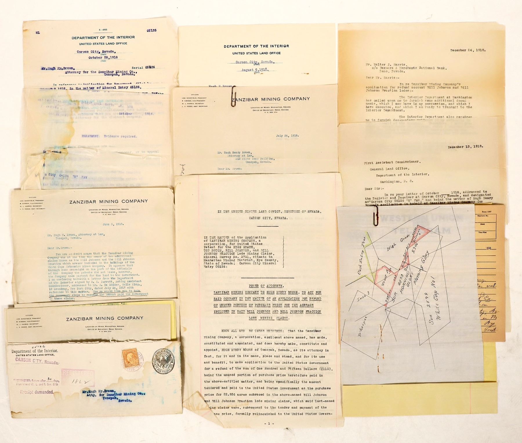 A collection of legal and financial correspondence to the Zanzibar Mining Company of Manhattan, Nevada, dated 1918. The correspondence regards mining claims and land transactions, including one hand-drawn map of mining areas. Letters are all typewritten, though one handwritten telegram transcript is included. The text of a few letters has been blurred through water damage.