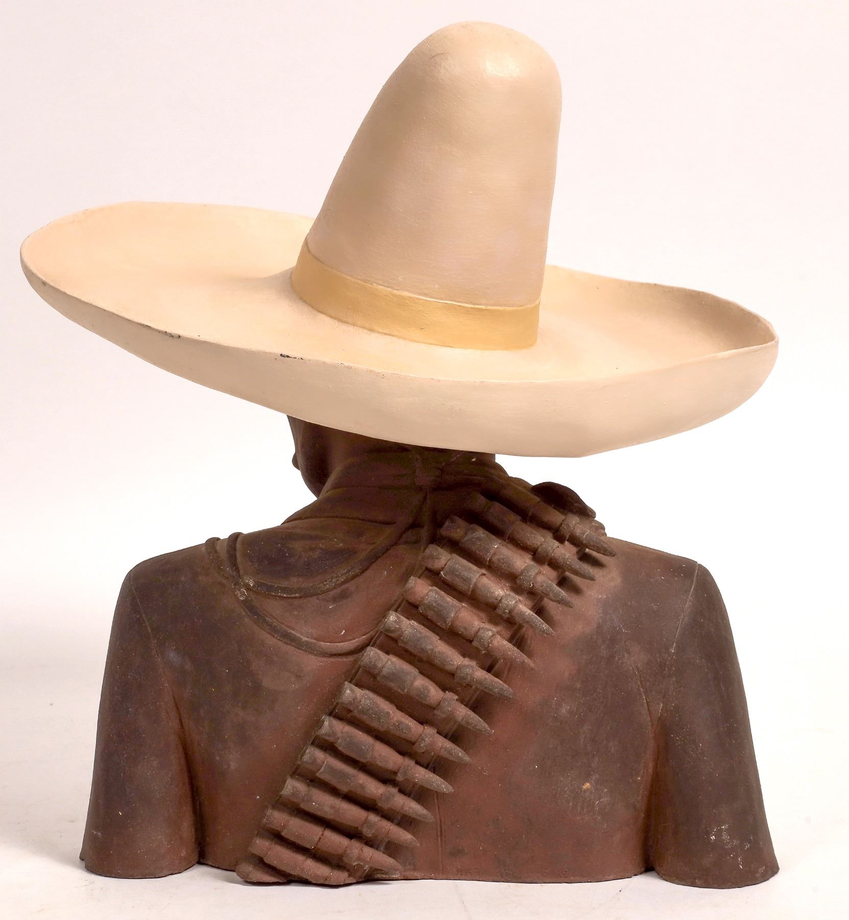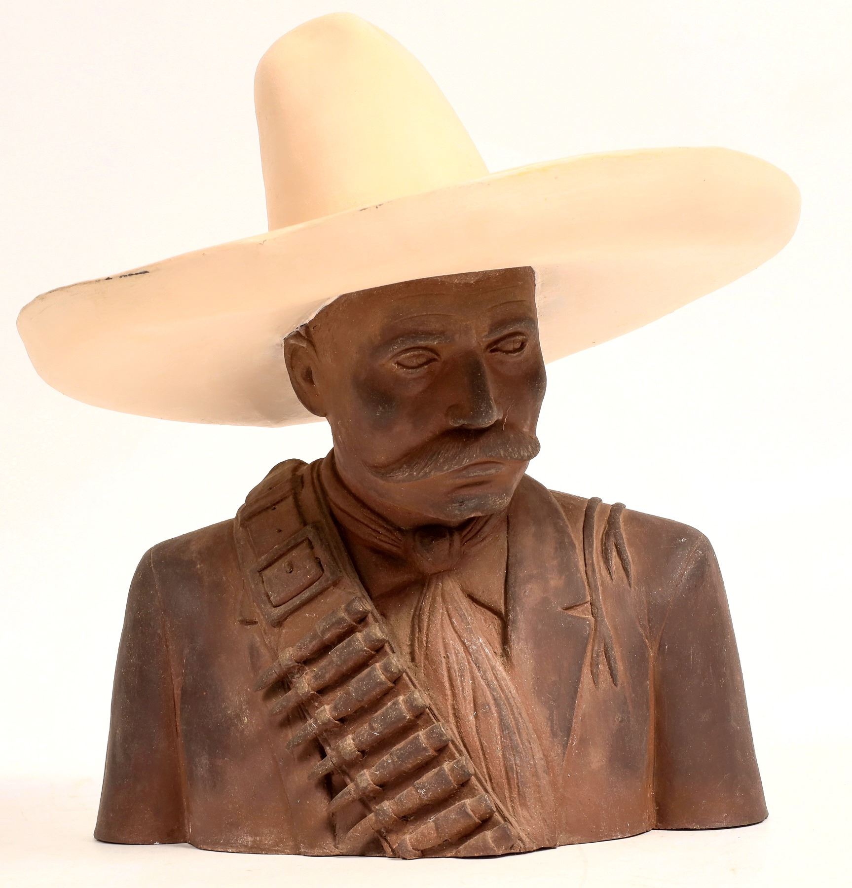 Sculpture of Mexican man, most likely Zapata, who was a legendary leader of the Mexican Revolution and champion of the rural poor in southern Mexico. Though assassinated in 1919, he remains an iconic figure in Mexico and as such was the historical inspiration for the Zapatista Movement and Uprising in Chiapas Mexico in 1994. Unsigned, 12x11". Artist is Arturo (1985)