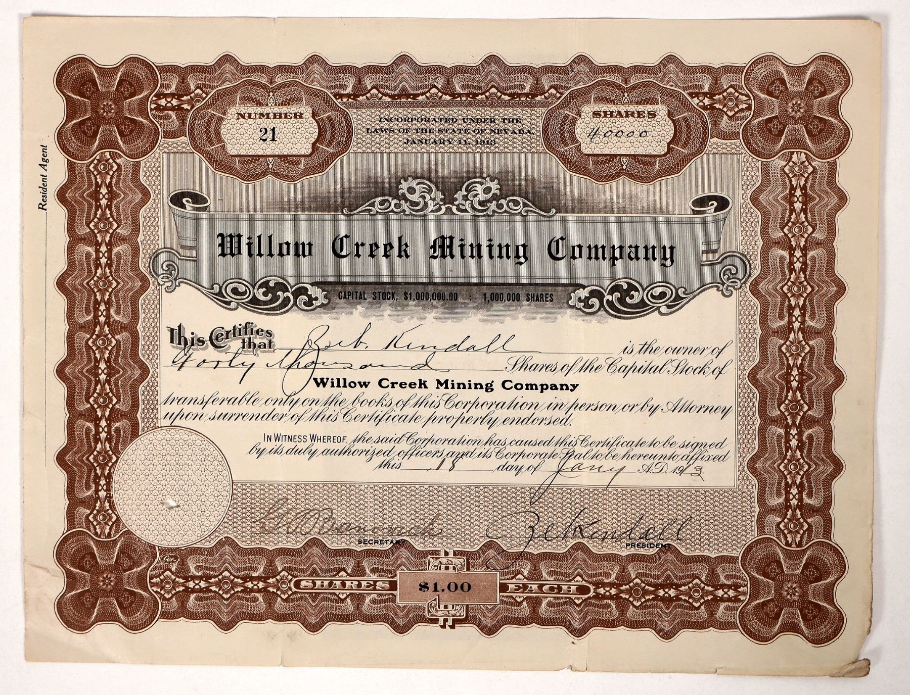 Zeb Kendall,(1875-1954) one of Nevada's last Bonanza Kings, took his fortune from the Mizpah Mine in Tonopah at the beginning of the 20th century. A former Nevada State Senator, Kendall became head of the Consolidated-Virginia mine on the Comstock Lode in 1919. He held a seat on the San Francisco Mining Exchange and also headed the Mexican Gold and Silver Mining Company and the Ophir Mining Company. This 1913 stock certificate from the Willow Creek Mining Company is both issued to and signed by Zeb Kendall, for 40,000 shares. Certificate number 21.