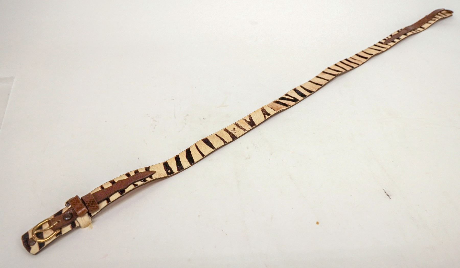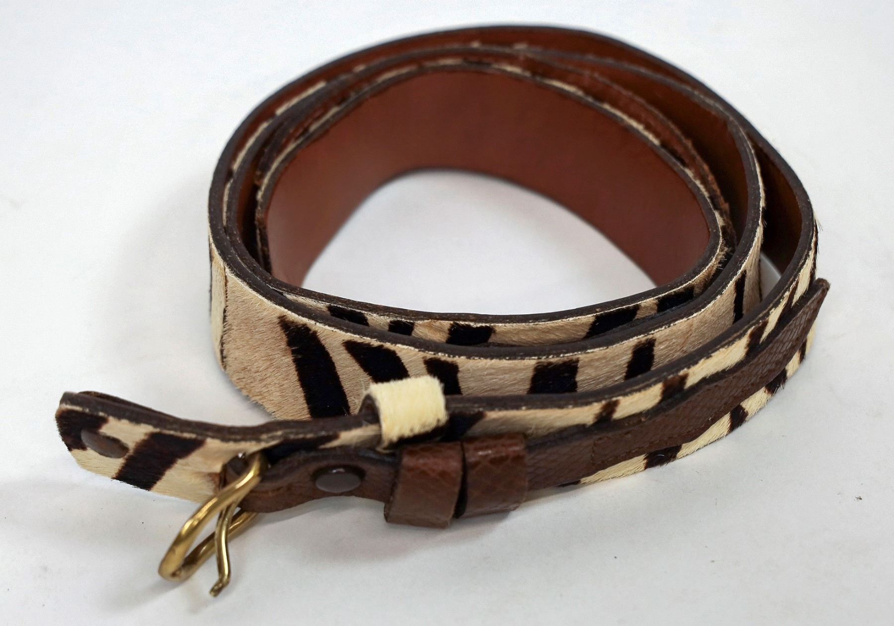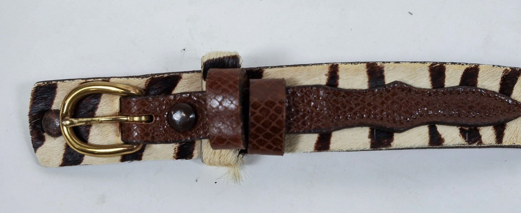 This lady's fashion belt is horse hair with a zebra pattern. Overall length is 42 in. actual waist size about 36 in. To be worn with leopard print shoes to your next urban watering hole.