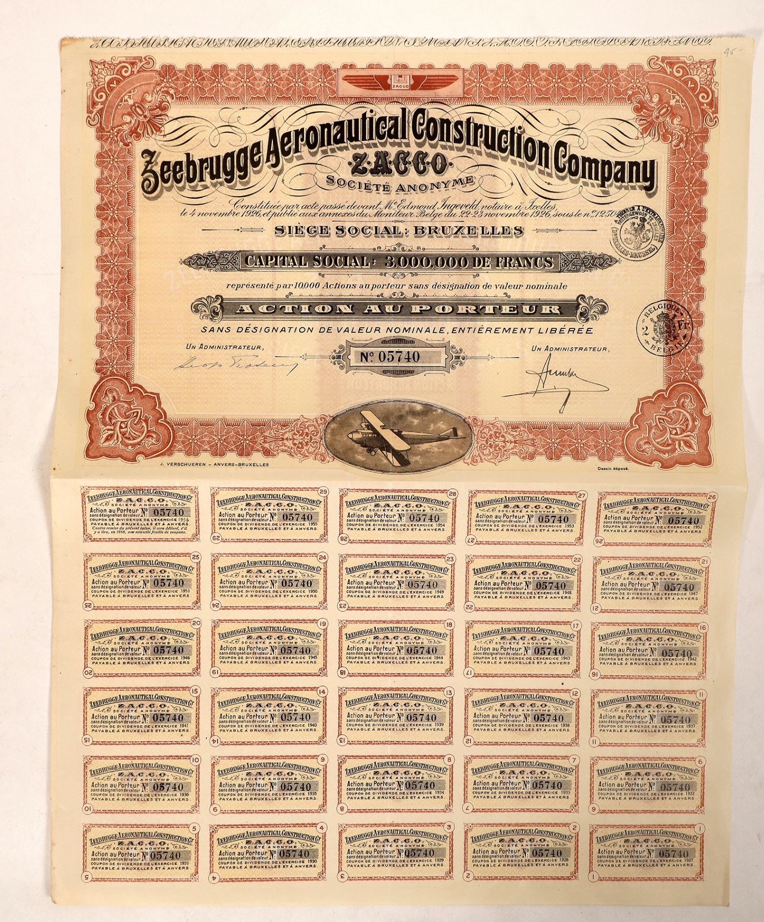 I/U. Rare certificate of a Belgium aircraft company of the 1920ís located in Zeebrugge. !0,000 bearer shares, Reddish border, issued 1926, coupons attached, printer : L Verchueren Brussels. EF cond. The company was an innovator of aircraft design building one of the WOrldís first all metal monoplane and later a two seat all metal recon plane (1924). Renamed in 1925 Ateliers de Construction AÈronautique de Zeebrugge (ACAZ), building prototype of 2-seat reconnaissance fighter biplane (early 1926); survived to 1933. to indifference to Belgium designers at the time, the company folded.[ Belgium Ken Prag Collection