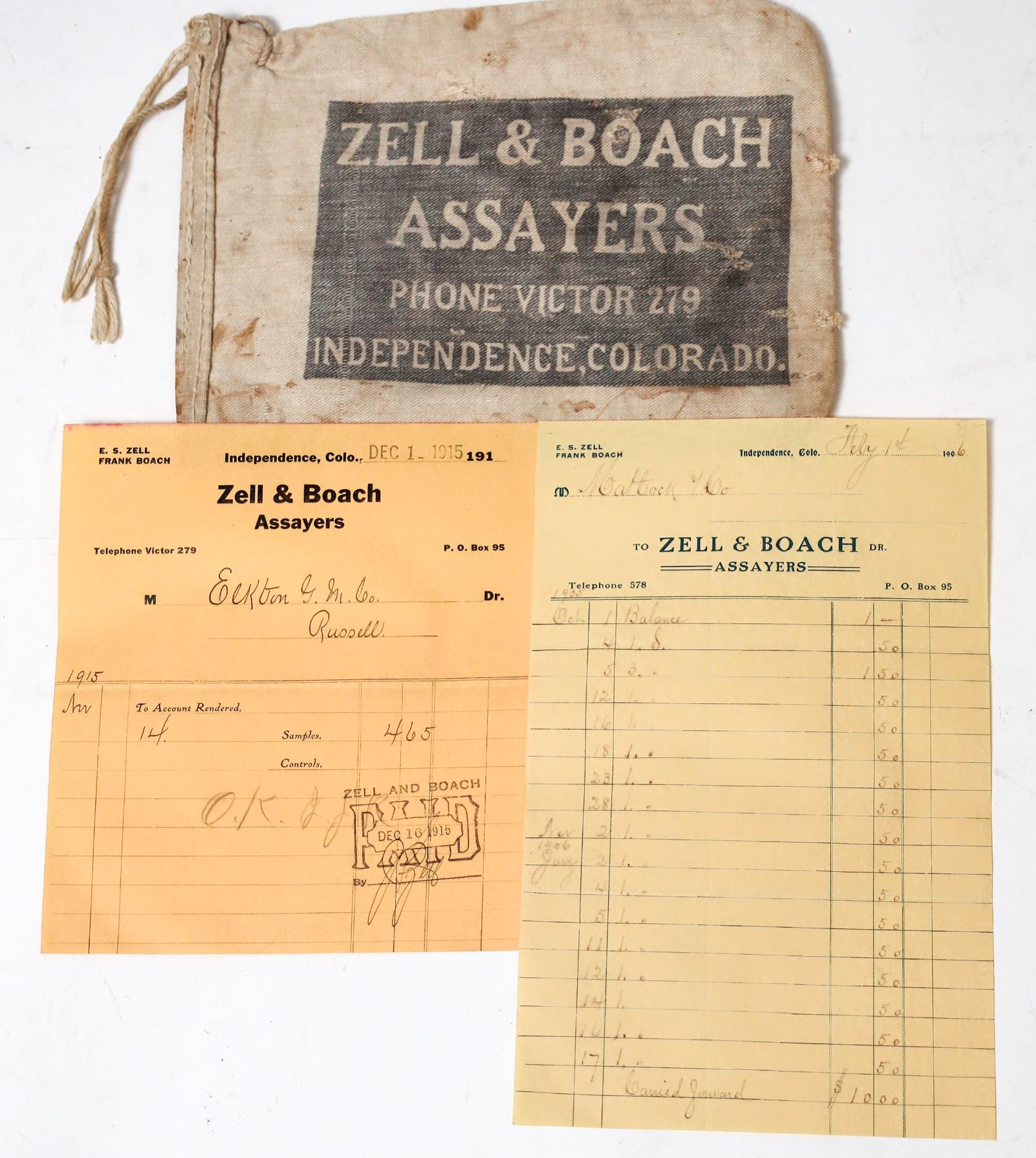 Small cloth ore bag, 6.5x8.5', labeled Zell & Boach Assayers with 2 assay sample receipts, 1906 and 1915. Light stains.