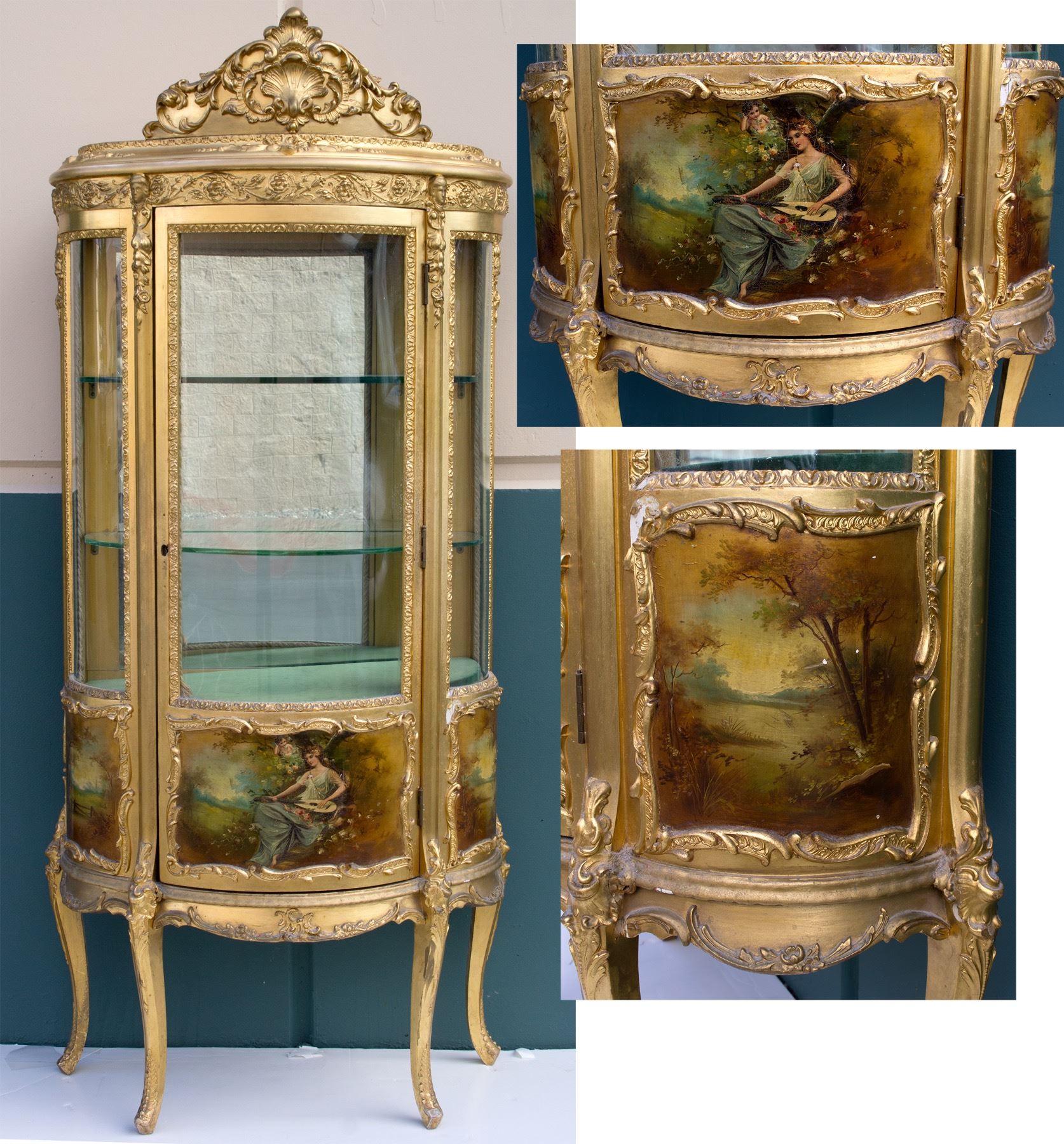 Joe Zemansky was a character himself. Before he came to Reno he owned a gambling parlor in Kansas City, had a chain of jewelry stores in Southern California, was part owner of the famous Aquascalientes Resort in Mexico and managed the black heavyweight champion Jack Johnson. He became the owner of Club Fortune a few months after it opened and closed its doors in 1947 after a ten-year run. [The rise of the Biggest Little City by Kling.] This exquisite piece of furniture comes directly from the Zemansky family. Painted gold, cured glass and three French style scenes make this the perfect piece to show off your most valuable treasures from this historic family. Due to its size and delicate nature, there will be an additional shipping charge if not picked up in person.