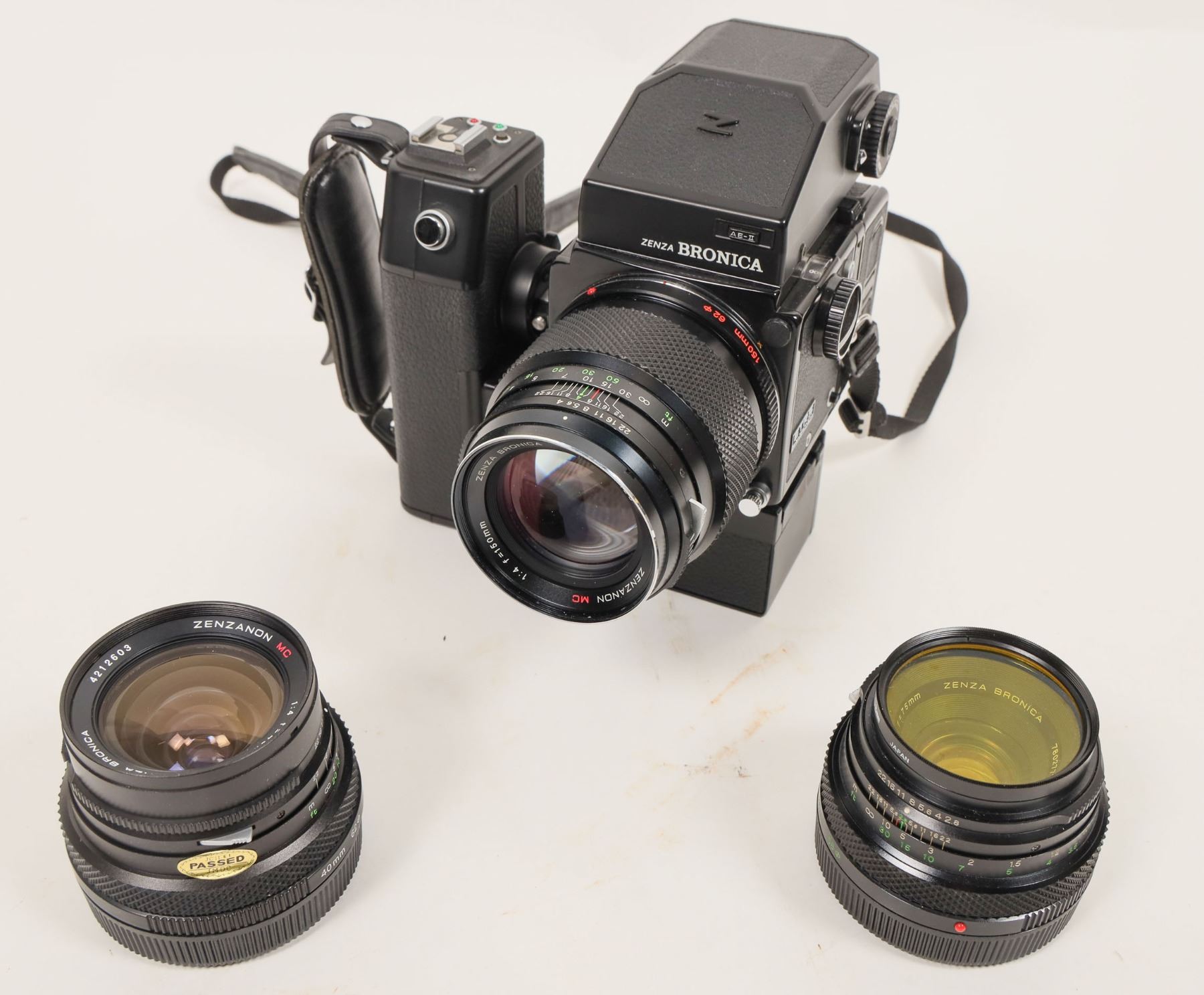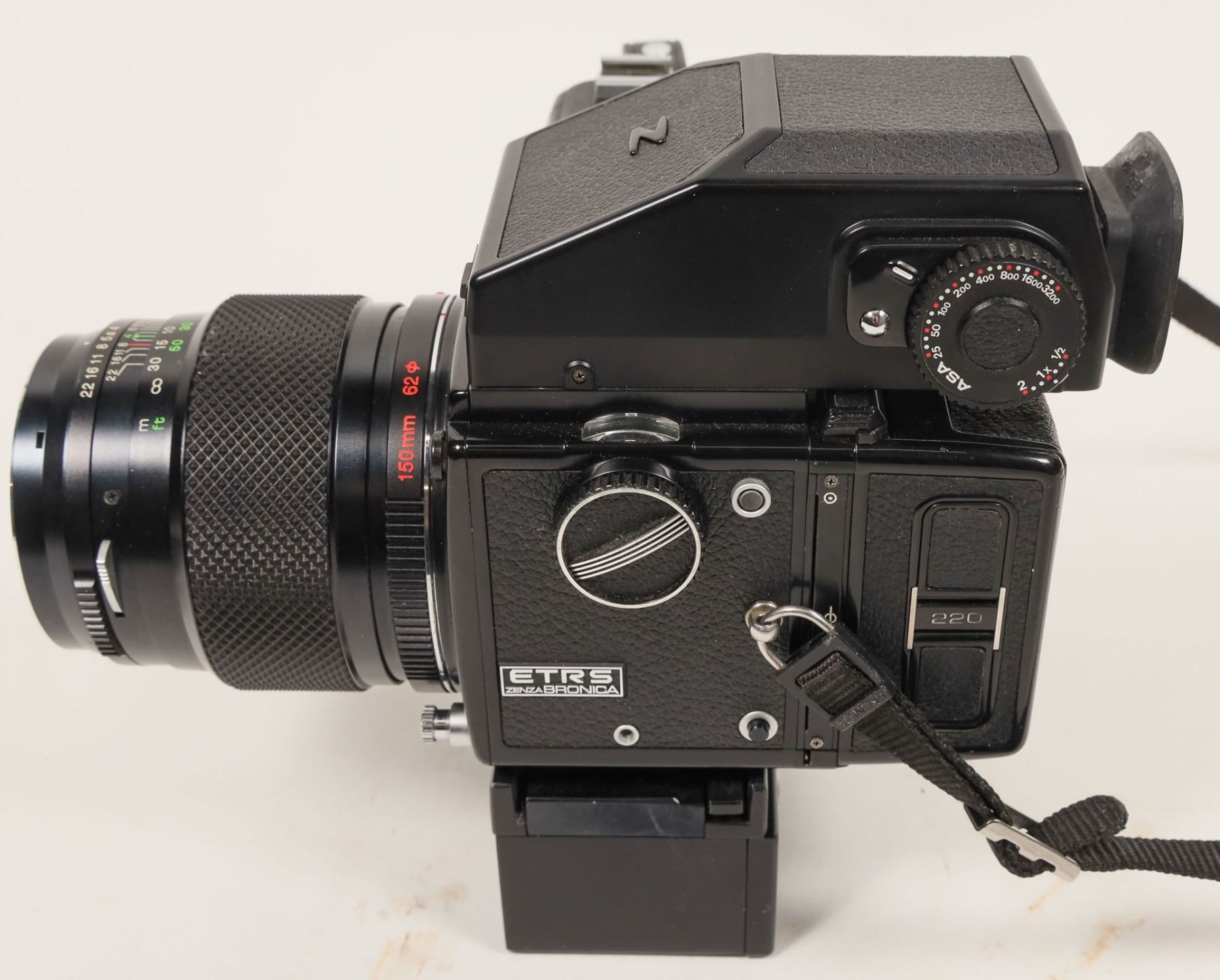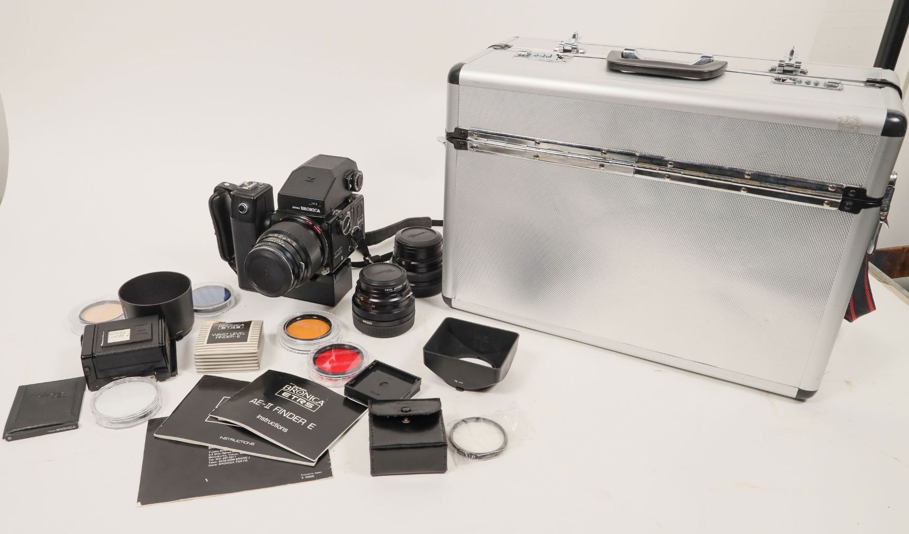 Zenza Bornica ETRS. Includes 150mm F4 lens, also mint condition; 40mm F4 lens, 75mm f2.8 lens; 220 film back; 1210 film back; Waist level Finder-E; grip and motor drive; various filters, see photo. all manuals. Specialized Aluminum case (no brand name visible). Not tested. Appears to be unused.