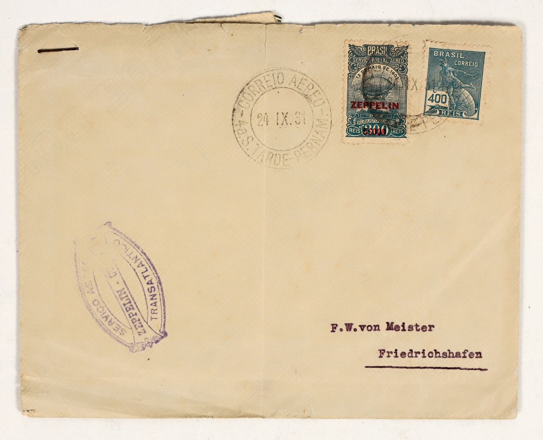 Cover 5 X 6.5 ". Stamped Zeppelin Servico Aereo Transatlantico, Zeppelin 300 Reis stamp and 400 Brasil stamp.