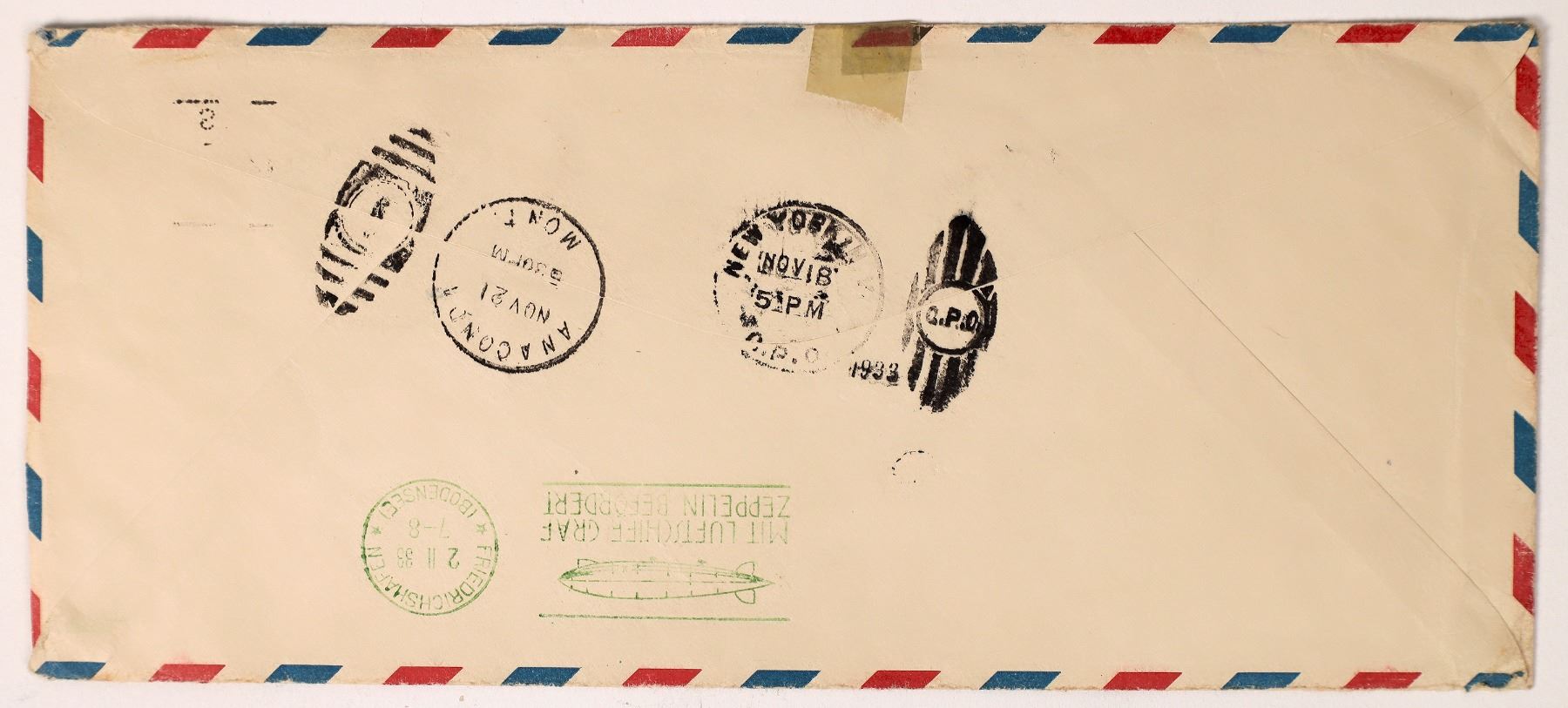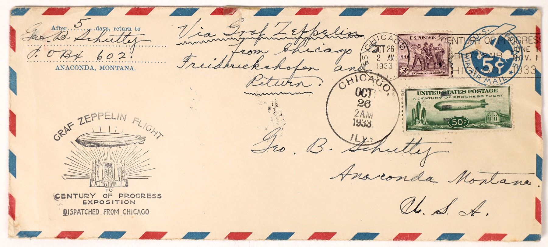 This cover has a lot going for it. Chicago 1933 circular postmark. 5c air mail entire with a 3c U. S. postage stamp and a 50c U. S. A Century of Progress flight stamp. Bottom right had a stamped Graf Zeppelon Flight stamp (A Century of Progress exposition). Addressed to Freidrickshofen and return. See Photo!