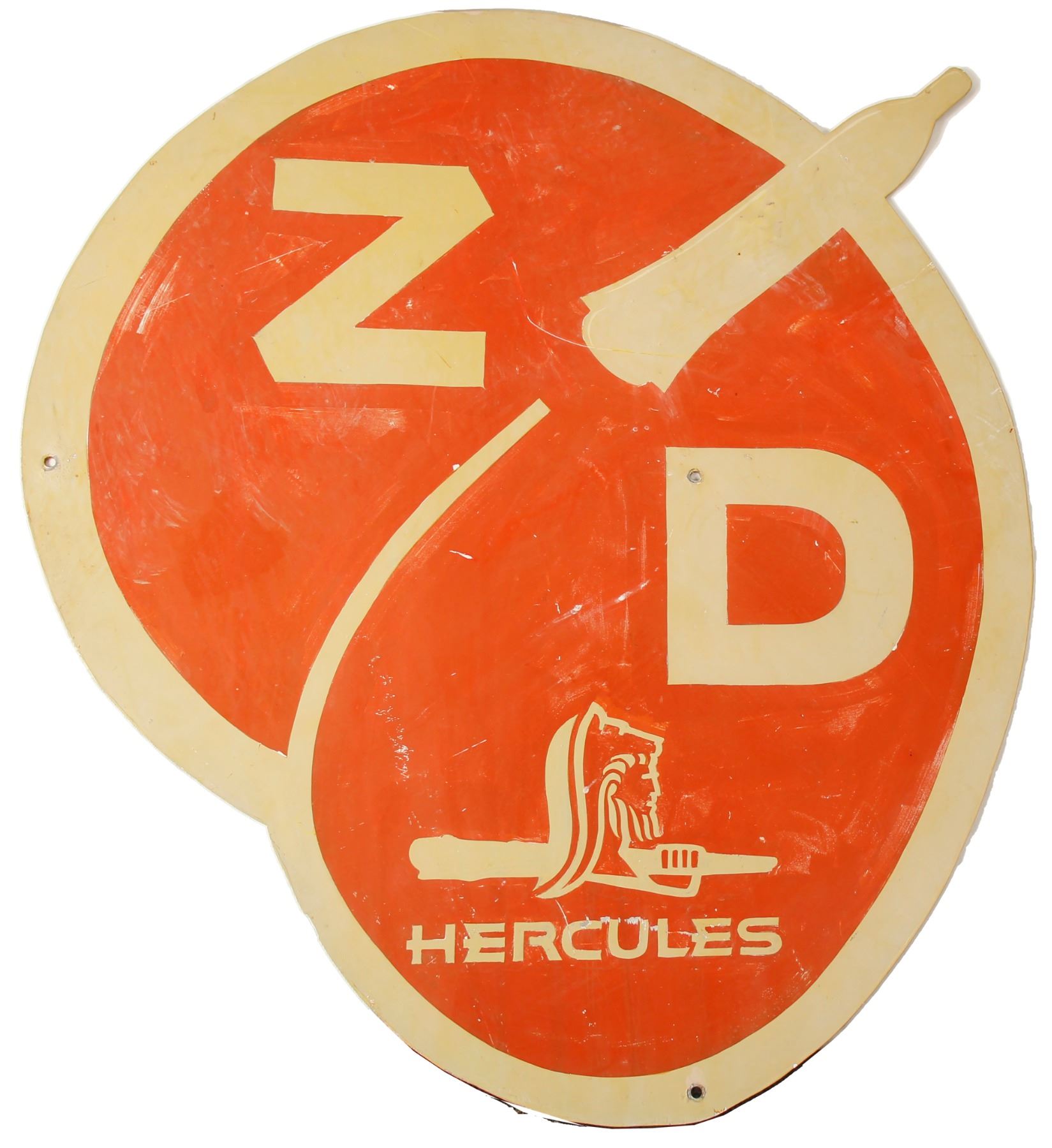 The Baccus Hercules Plant was opened in 1915. 32 x 51" hand painted tin sign in orange and beige. "ZD" for "zero Deaths" Pollock Collection. State: Utah City: BAccus Date: HWAC# 84831