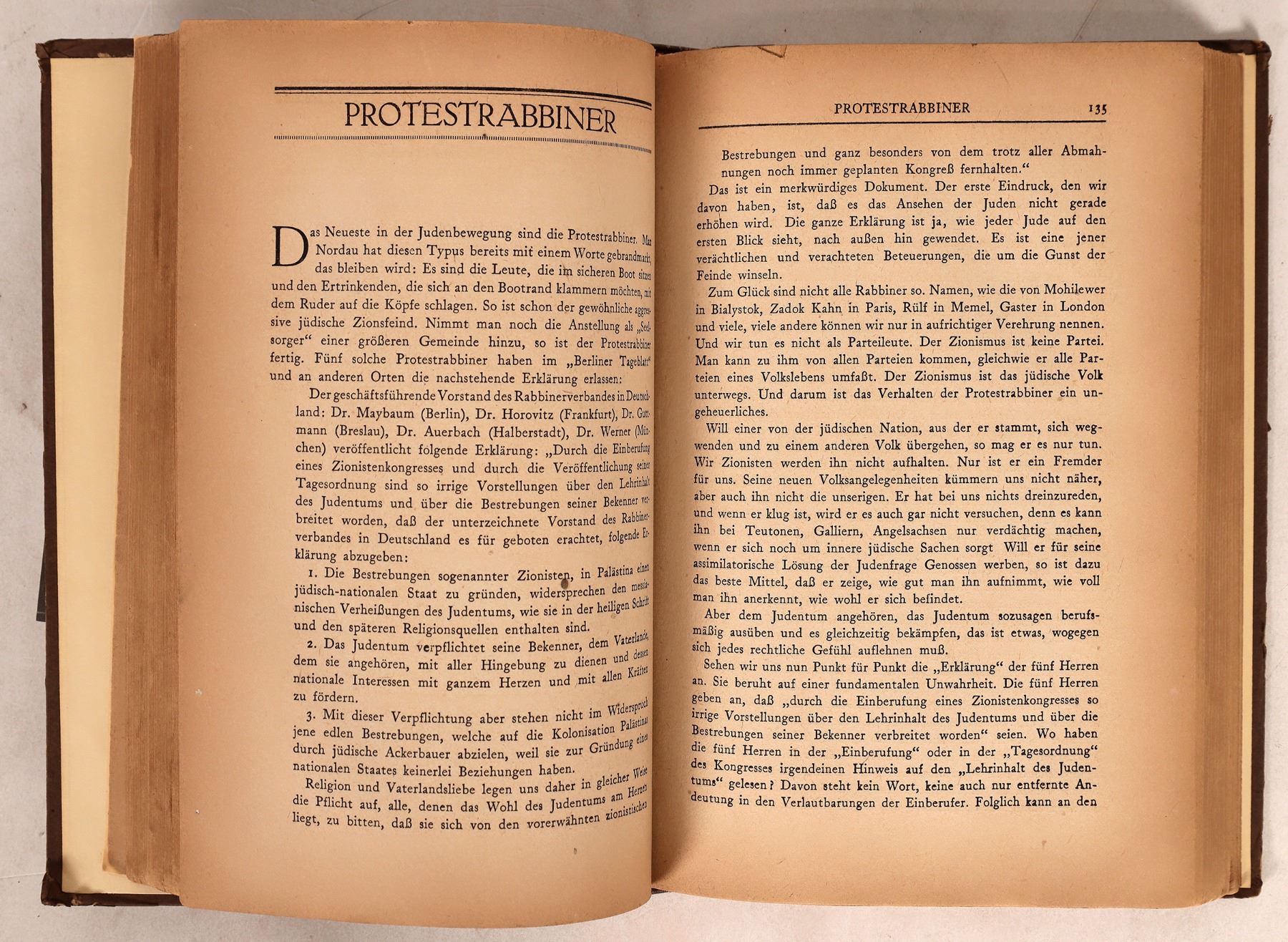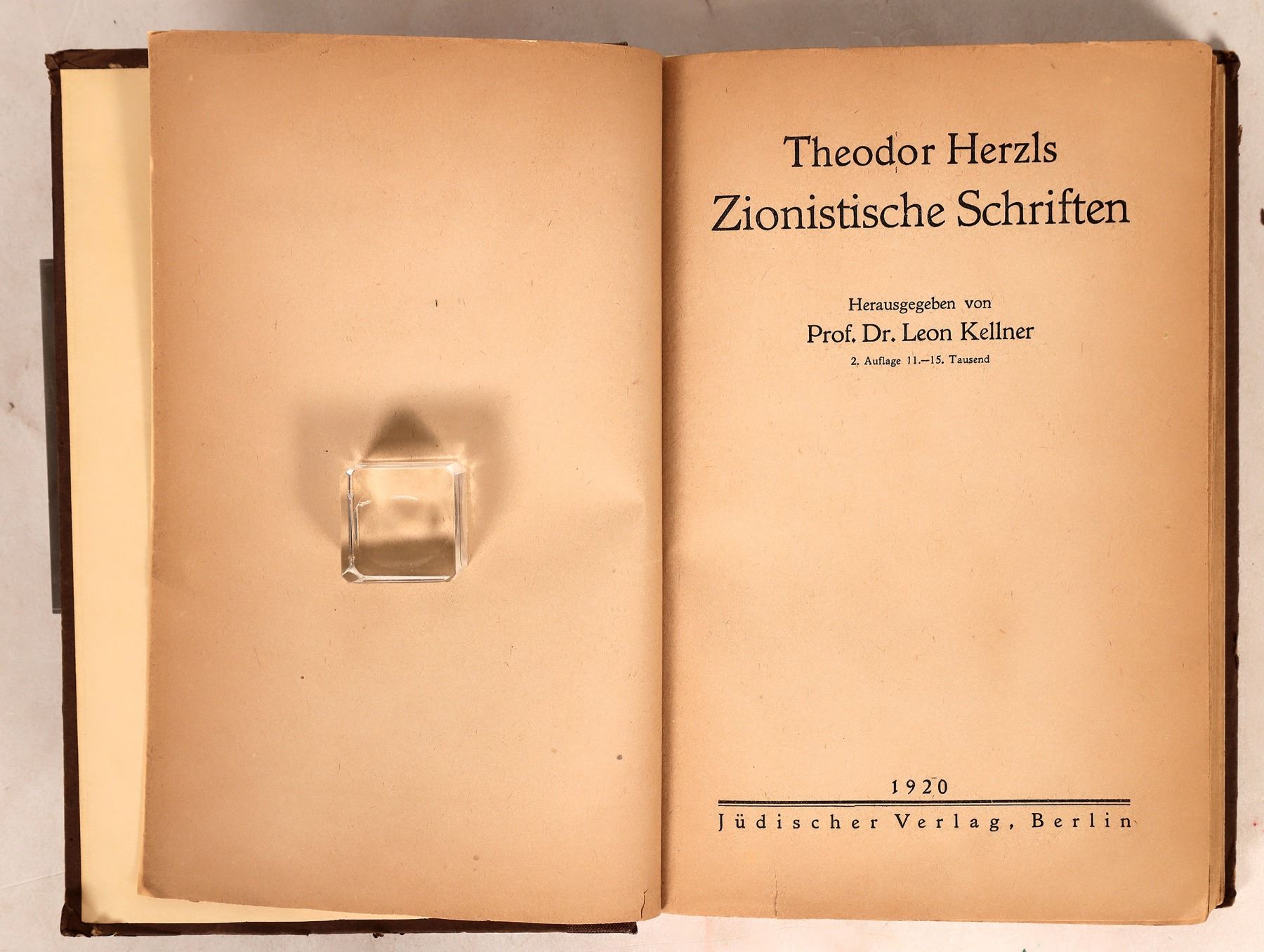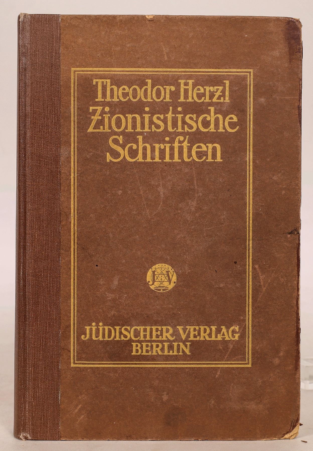 1905 Zionistische Schriften by Theodor Herzl. In German, we are unsure of exact contents but does discuss Zionism. 374pp which are browning, binding has wear, mainly on corners. "Theodor Herzl (born May 2, 1860, Budapest, Hungary, Austrian Empire [now in Hungary]died July 3, 1904, Edlach, Austria) was the founder of the political form of Zionism, a movement to establish a Jewish homeland. His pamphlet The Jewish State (1896) proposed that the Jewish question was a political question to be settled by a world council of nations. He organized a world congress of Zionists that met in Basel, Switzerland, in August 1897 and became the first president of the World Zionist Organization, established by the congress. Although Herzl died more than 40 years before the establishment of the State of Israel, he was an indefatigable organizer, propagandist, and diplomat who had much to do with making Zionism into a political movement of worldwide significance." from britanica.com