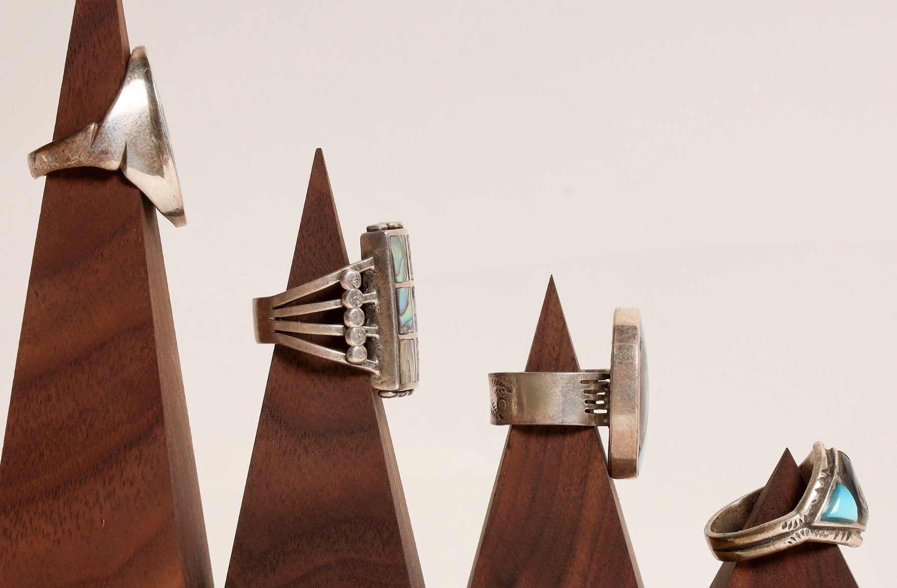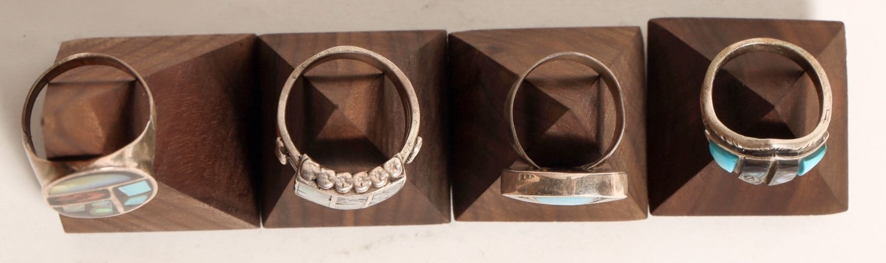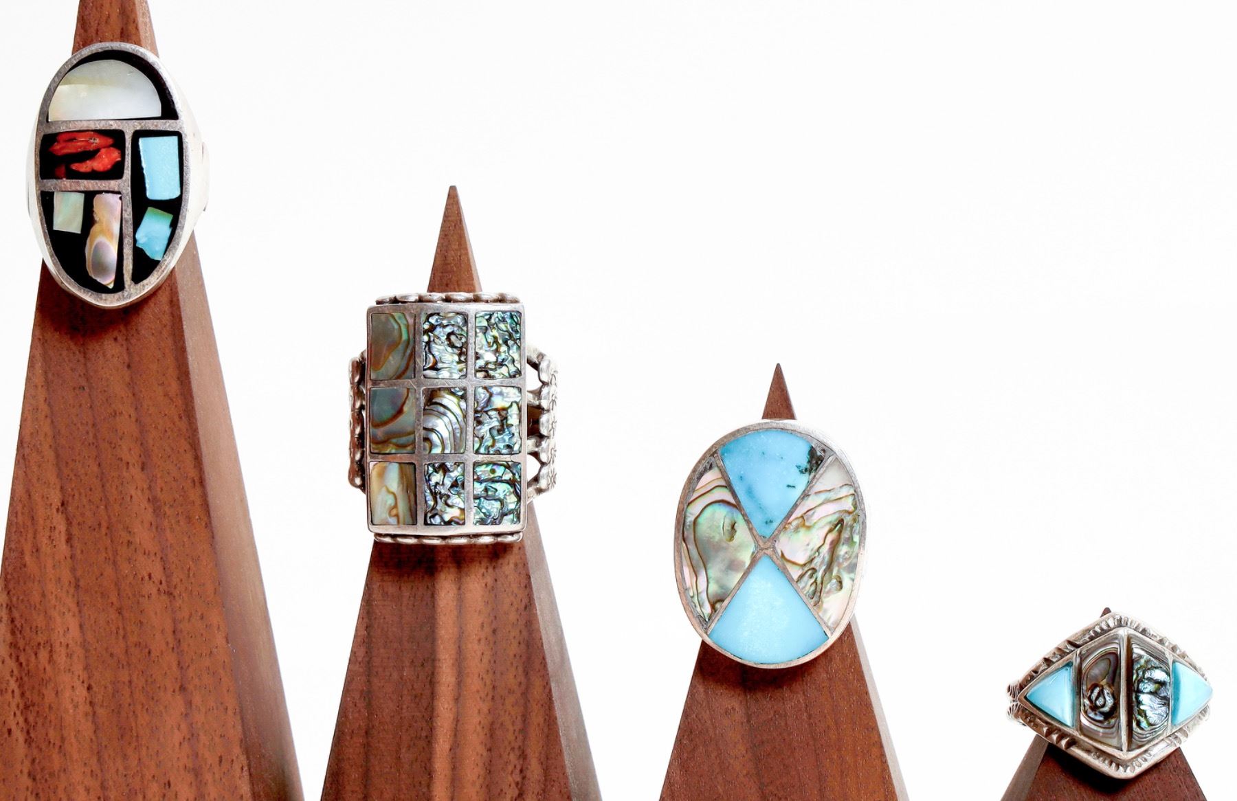 Four men's rings that incorporate inlaid abalone shell. Three of the rings have turquoise as well. Abalone shell is often placed on eyes after death for sight. Ring sizes as pictured from left to right: 10, 11, 9, 11 No hallmarks. Collection of Frank Lewton. [] [] [] [] []
