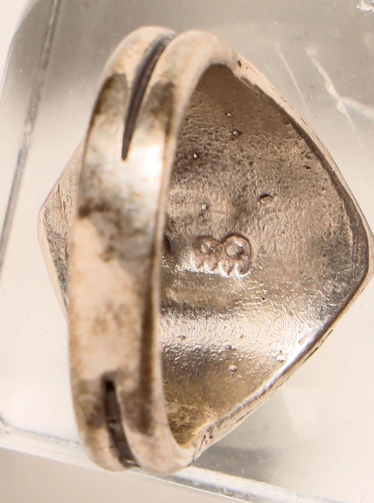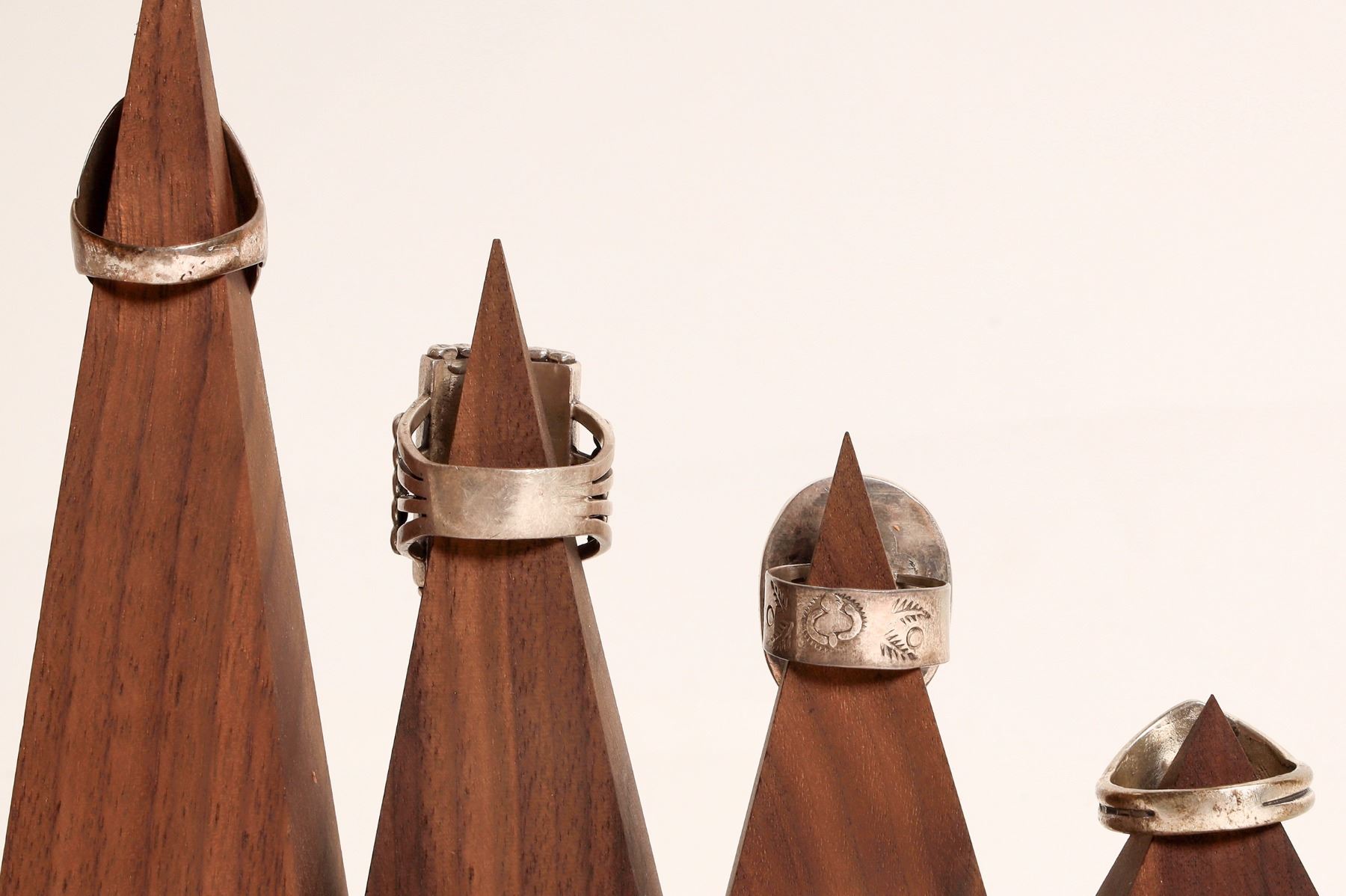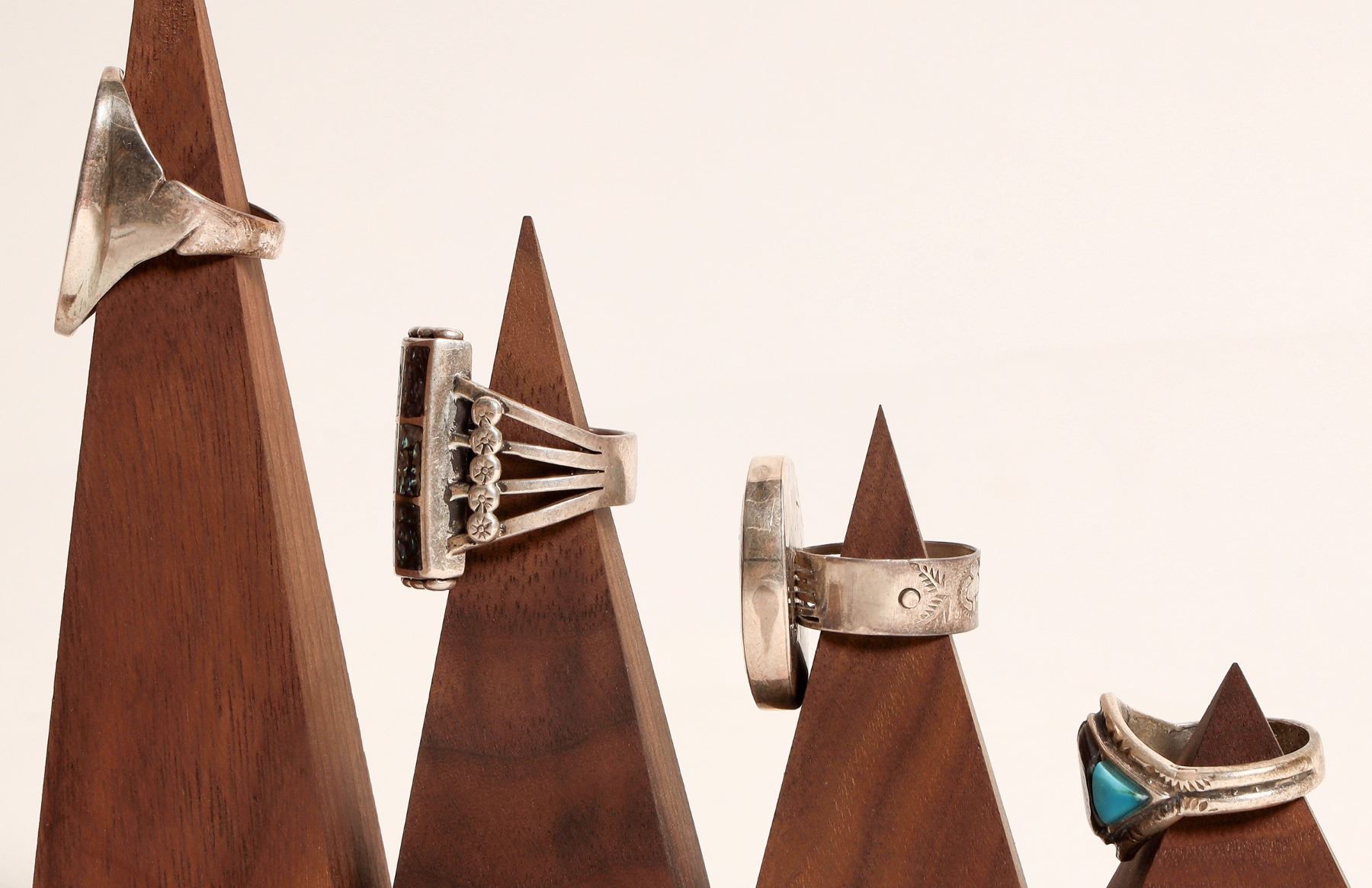 Four men's rings that incorporate inlaid abalone shell. Three of the rings have turquoise as well. Abalone shell is often placed on eyes after death for sight. Ring sizes as pictured from left to right: 10, 11, 9, 11 No hallmarks. Collection of Frank Lewton. [] [] [] [] []