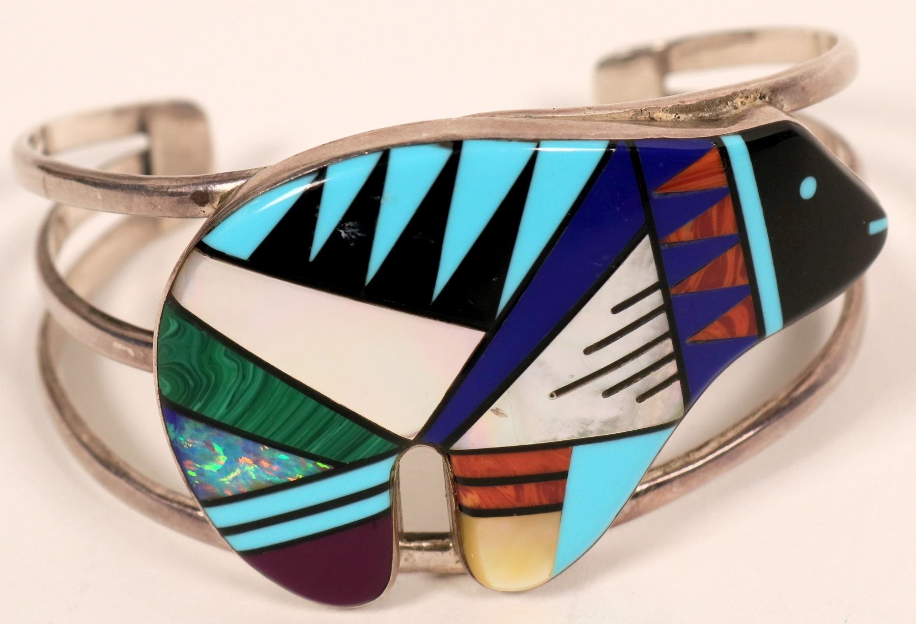 This is a nicely done Zuni bear fetish bracelet consisting of turquoise, jet, opal, mother of pearl and spiny oyster, bear is about 2’ across by 1-1/4” tall set on sterling bands.