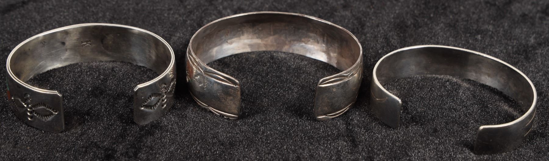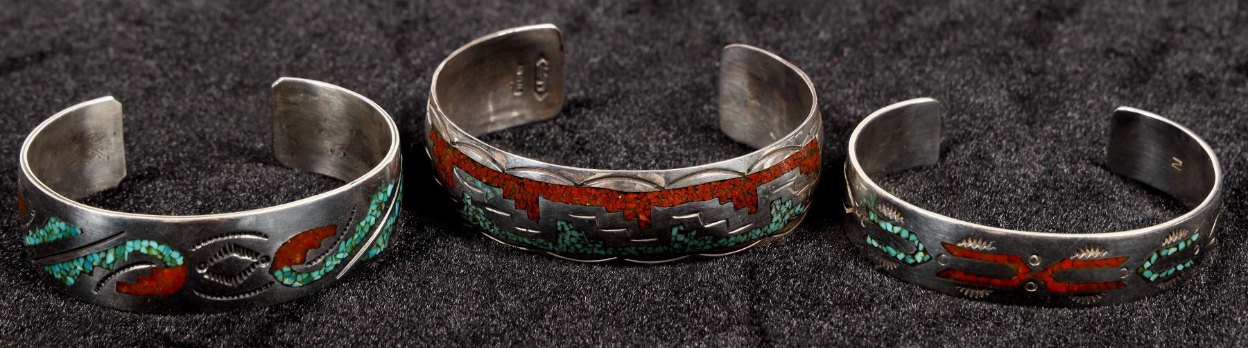 Zuni women's bracelets, appear to be sterling silver & turquoise. 3 different artists, all Zuni Pueblo carved. Two bracelets measure 6.5", and the one with a blue/red banding measures 7".