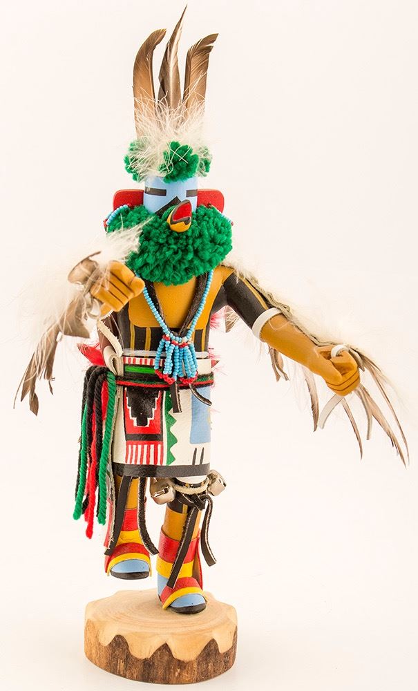 This Eagle Dancer is very colorful, wears a yarn neck collar, necklace, feathers and a painted skirt. Very nicely detained. 13" x 7" x 6.5". Signed Luther Lutse. Date: 1992 Location: Arizona/New Mexico HWAC # 52139