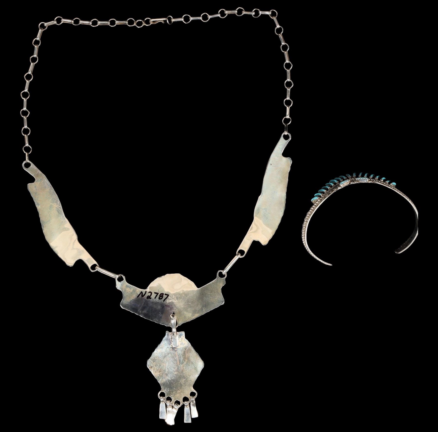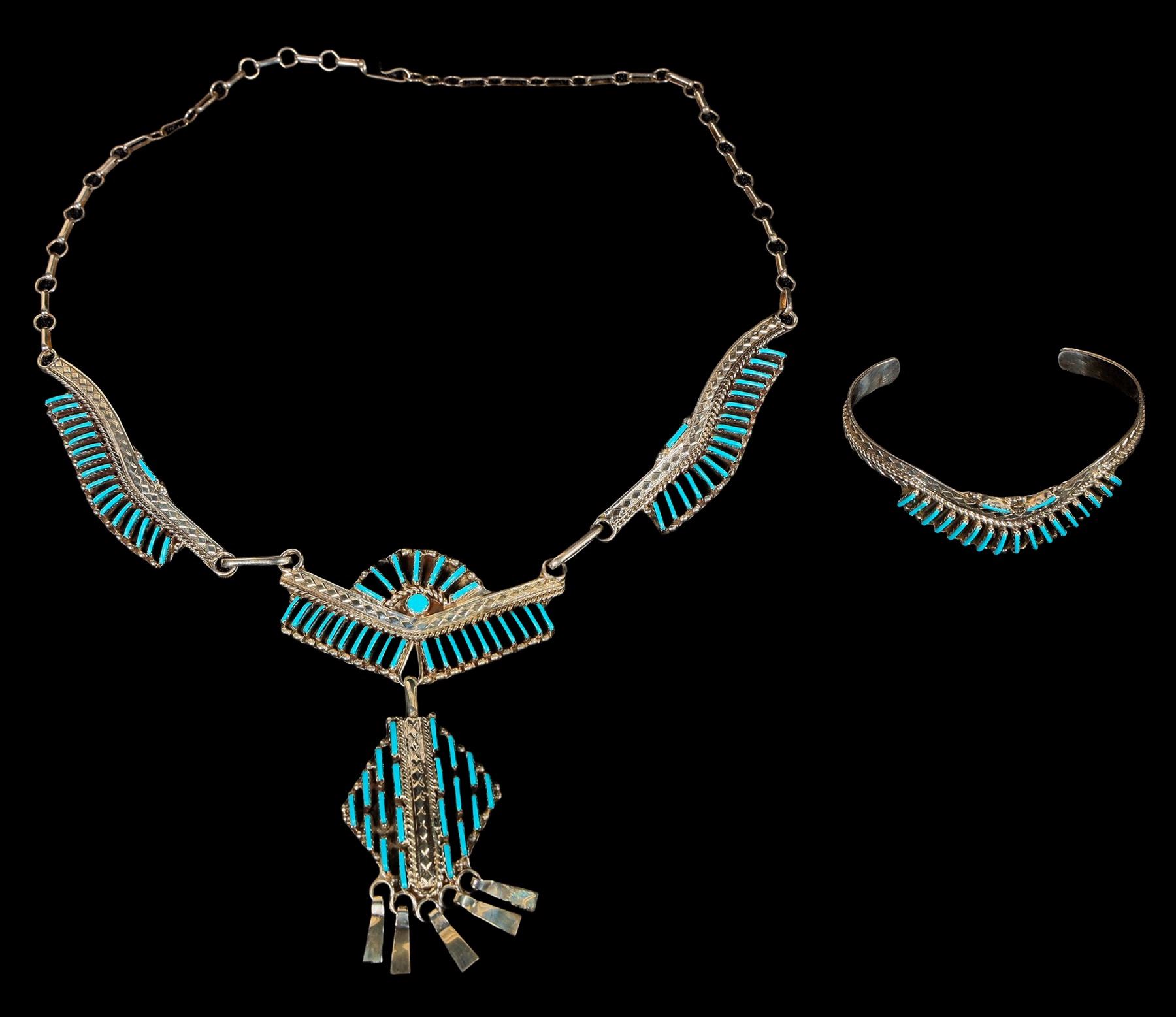 This is a beautiful Zuni made Turquoise necklace set consisting of a matching necklace and bracelet, the hanging piece at the base of the necklace is also detachable and can be worn as a separate piece when placed on a chain, necklace measures 12" top to bottom, all set in sterling silver and carrying an HN hallmark.