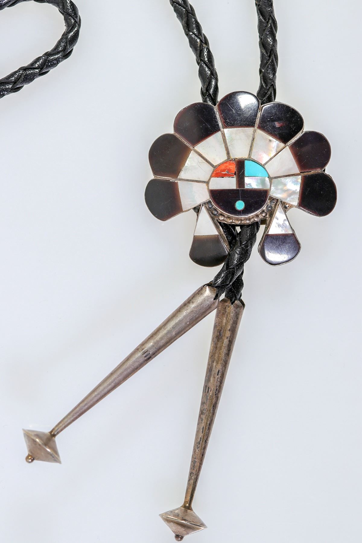 Zuni Sun Face bolo, unknown artist. Beautiful mosaic inlay of onyx, mother of pearl, turquoise and coral. 1.75” x 1.75”. Black leather tie and silver tips. Excellent condition.