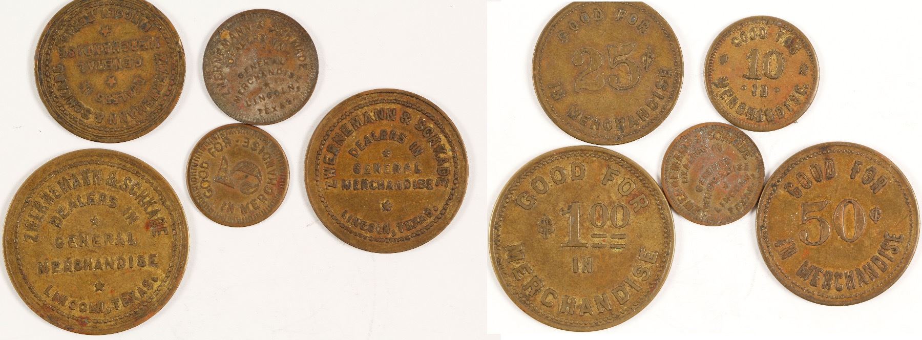 Five pieces. Good for 5c, 10c, 25c, 50c, and $1.00 Date: City: Lincoln State: Texas HWAC# 75419
