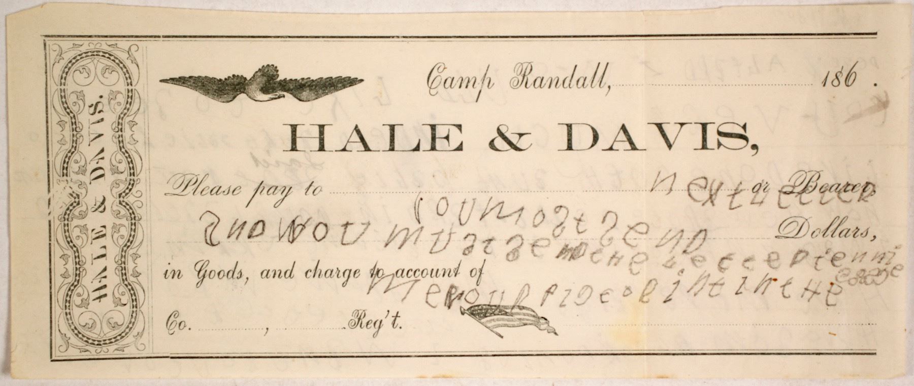 Hale & Davis, Camp Randall, 186_. Receipt was unused, but a child has used the paper to write in pencil at some point. Receipt is 3 x 7.25" Camp Randall was located on what is now the University of Wisconsin. It was a training facility of the Union army during the Civil War, where more than 70,000 recruits were trained. The Army also established a hospital and prisoner-of-war camp. Date: City: Madison State: Wisconsin HWAC# 77642