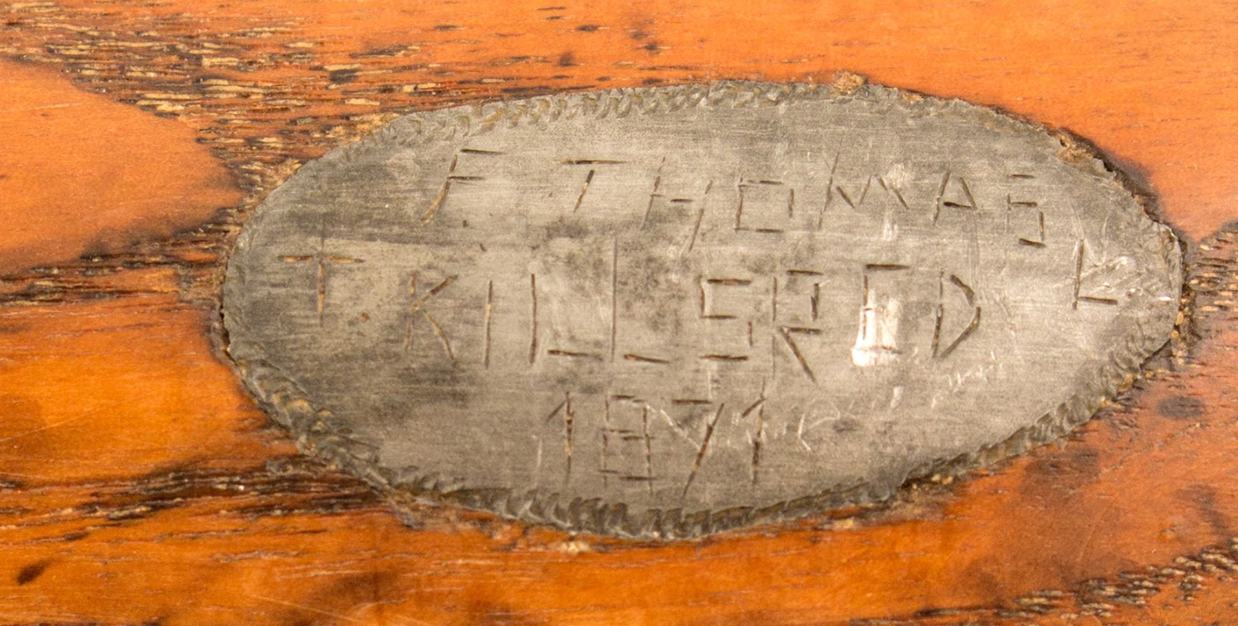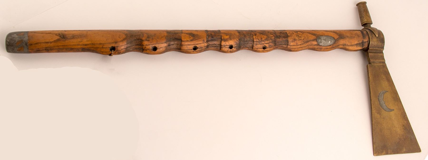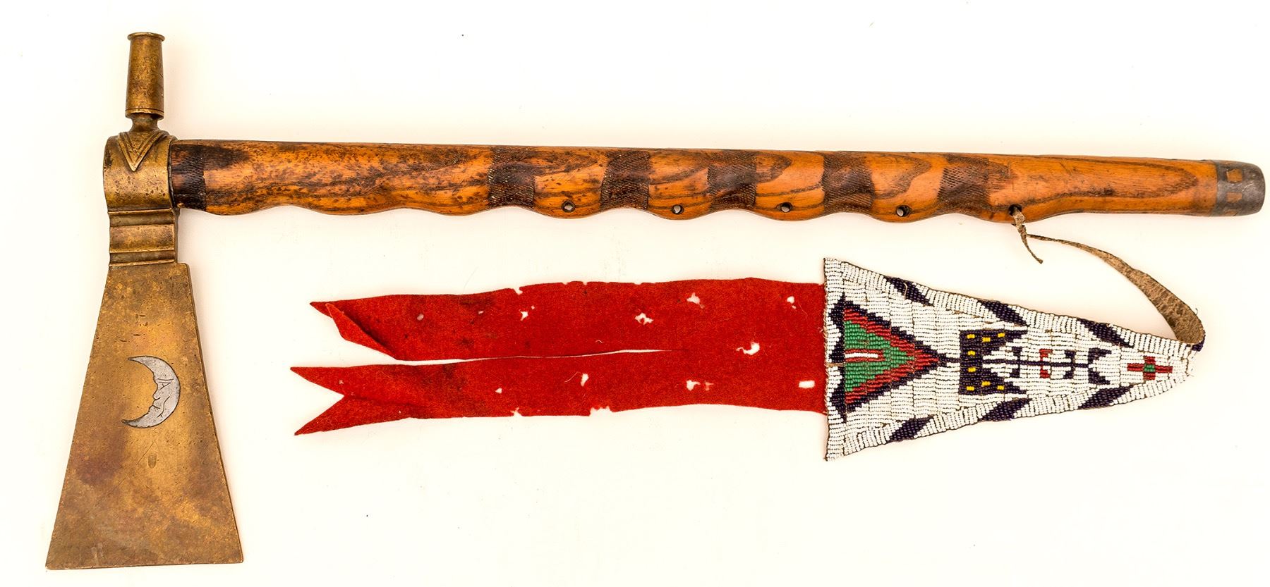 Batwing design with a crest shaped moon inlay in 11.25" brass blade on both sides. Smoking bowl on the end of the blade. Presentation plaque on handle: "F. THOMAS T. KILLS RED 1871". Multiple file brands on 24" handle. Beaded fall is sewn with sinew and red trade cloth. Very nice condition and an attention getter. Consigned by The Cowboy Connection in Livingston, MT.