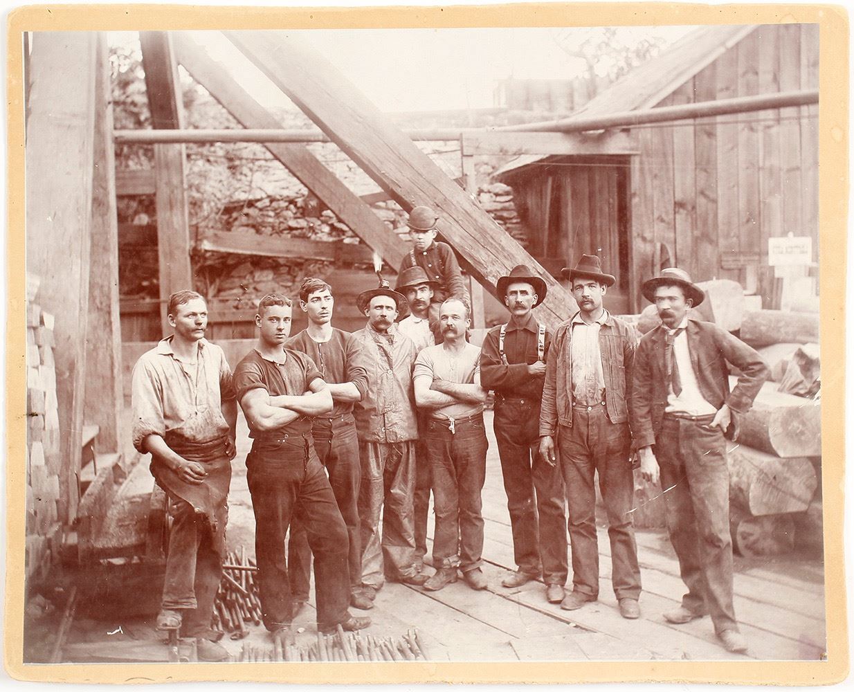 Iconic view! This large (8 x 10") mounted photograph shows nine miners and one child posing outside of a mine shaft in Virginia City, Nevada. One miner has a lit mining lamp. Also notice the piles of drill bits in the lower left. Neither the mine or photographer is identified. Minor wear. Provenance: Ayer Family Estate. Please see other Virginia City, Gold Hill, and Reno photographs from this family collection. Date: Location: Virginia City, Nevada HWAC# 55526