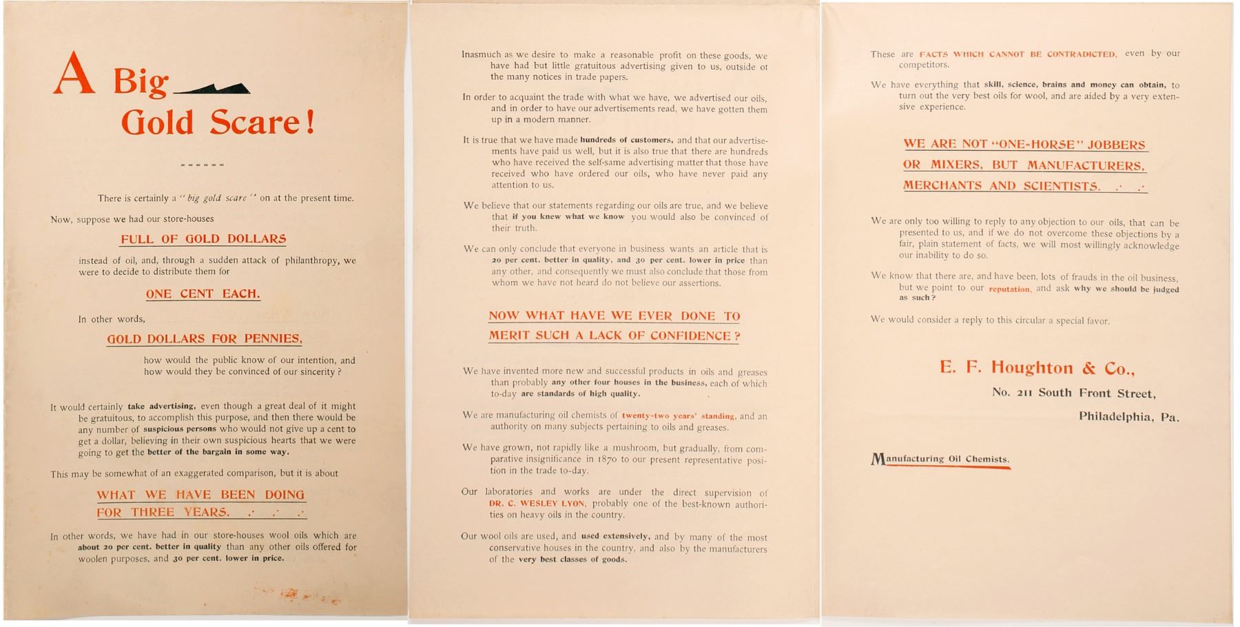 This 3pp brochure for E.F. Houghton & Co. in Philadelphia that begins by referencing "a big gold scare." We are able to date it to c.1890 based on the fact it mentions them being in business for 22 years and the company starting in the late 1860s. The brochure highlights their wool oil that is "20 percent better in quality...and30 percent lower in price." They say "we are not 'one-horse' jobbers or mixers, but manufacturers, merchants, and scientists." Company located at No. 211 South Front Street in Philadelphia. Color print. Separation starting on one panel. 9 x 6"