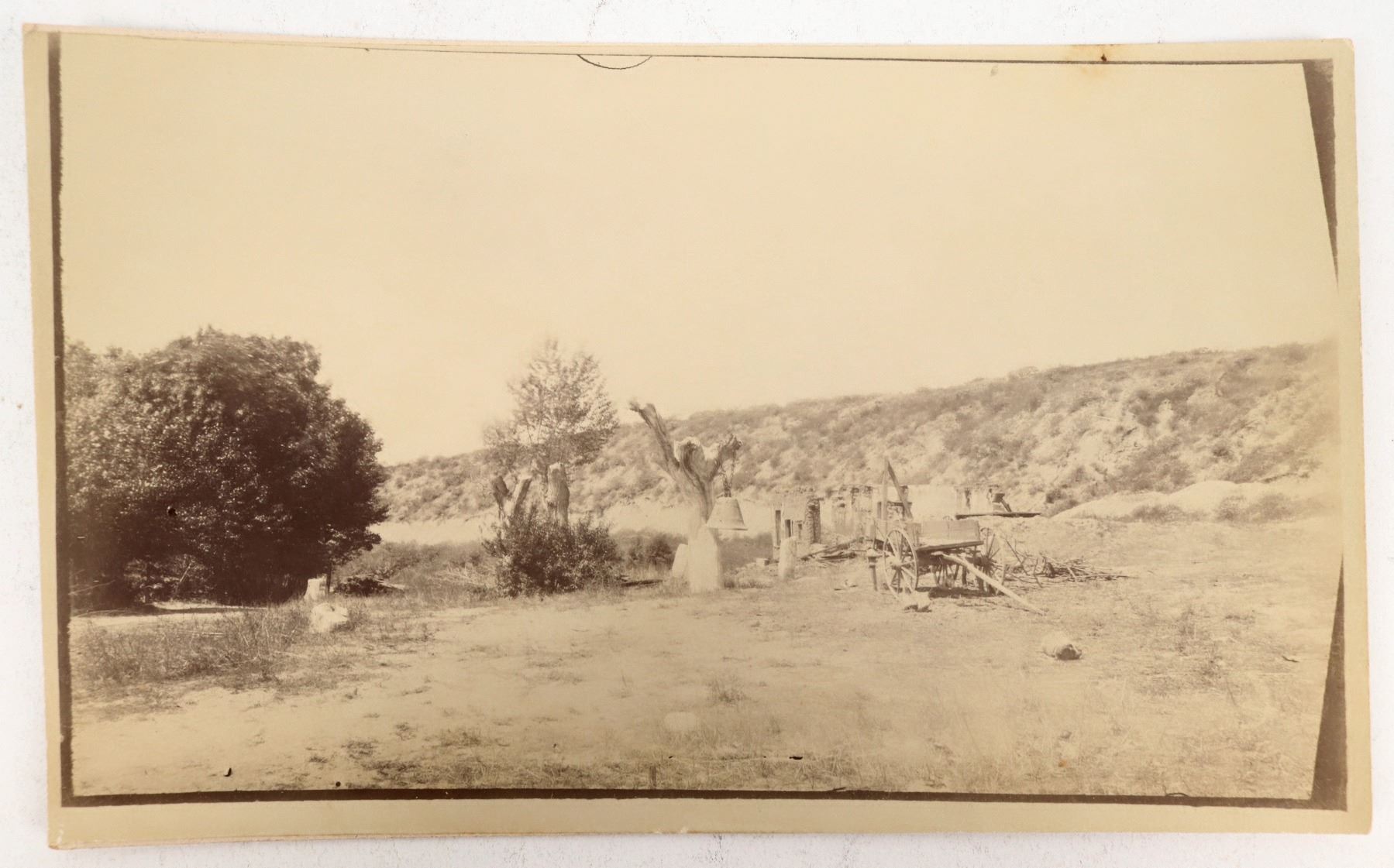 Western ghost town. Stone building ruins in the background, with a large bell hanging from an eerily human-looking tree. Location unknown--ID on back not original but claims "Austin, Nevada Camp" as the location. Measures 8x4.8". Good condition, see photo.