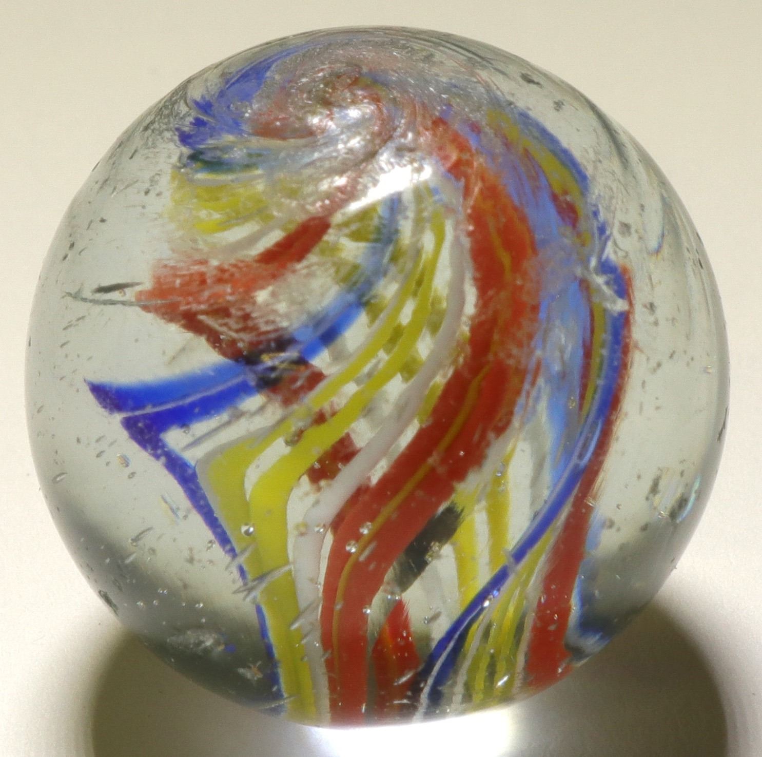 Very nice attractive specimen. This one is 7/8" in size with Divided Core". The colors are orange, cobalt blue n white, and pale yellow. Good condition with only a couple of pinheads, good clarity, and pontiled. ( RH). Stephen Hartman Collection
