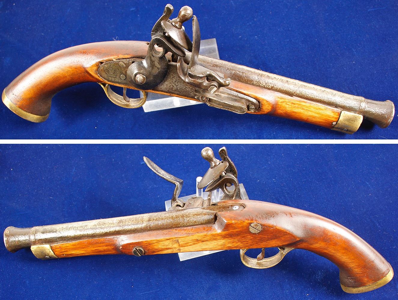 This is a replica non-firing blunderbuss flintlock pistol. The parts appear to have been made from an original British lock-plate and built around that piece. The piece is 15 3/4 in. overall length. THe stock is of walnut and finished in brass hardware. Date: Location: HWAC# 56226