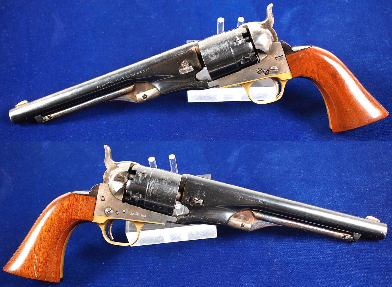 This replica Colt Army is chambered in .44 cal. with an 8 in. barrel and rebated cylinder. This gun is S/N 2533X date coded to 1992 made by Pietta. It is in used condition. This 4 screw frame is case hardened steel with color loss on both sides but has an attractive color on the recoil shield. The cylinder scene is the Colt naval battle scene lightly engraved. The loading lever is the attractive creeping style and has a spectacular bone case hardened finish. The grips are varnished and show some handing wear. This gun has been fired and shows wear on the cylinder bores, wedge, forcing cone and various screws.